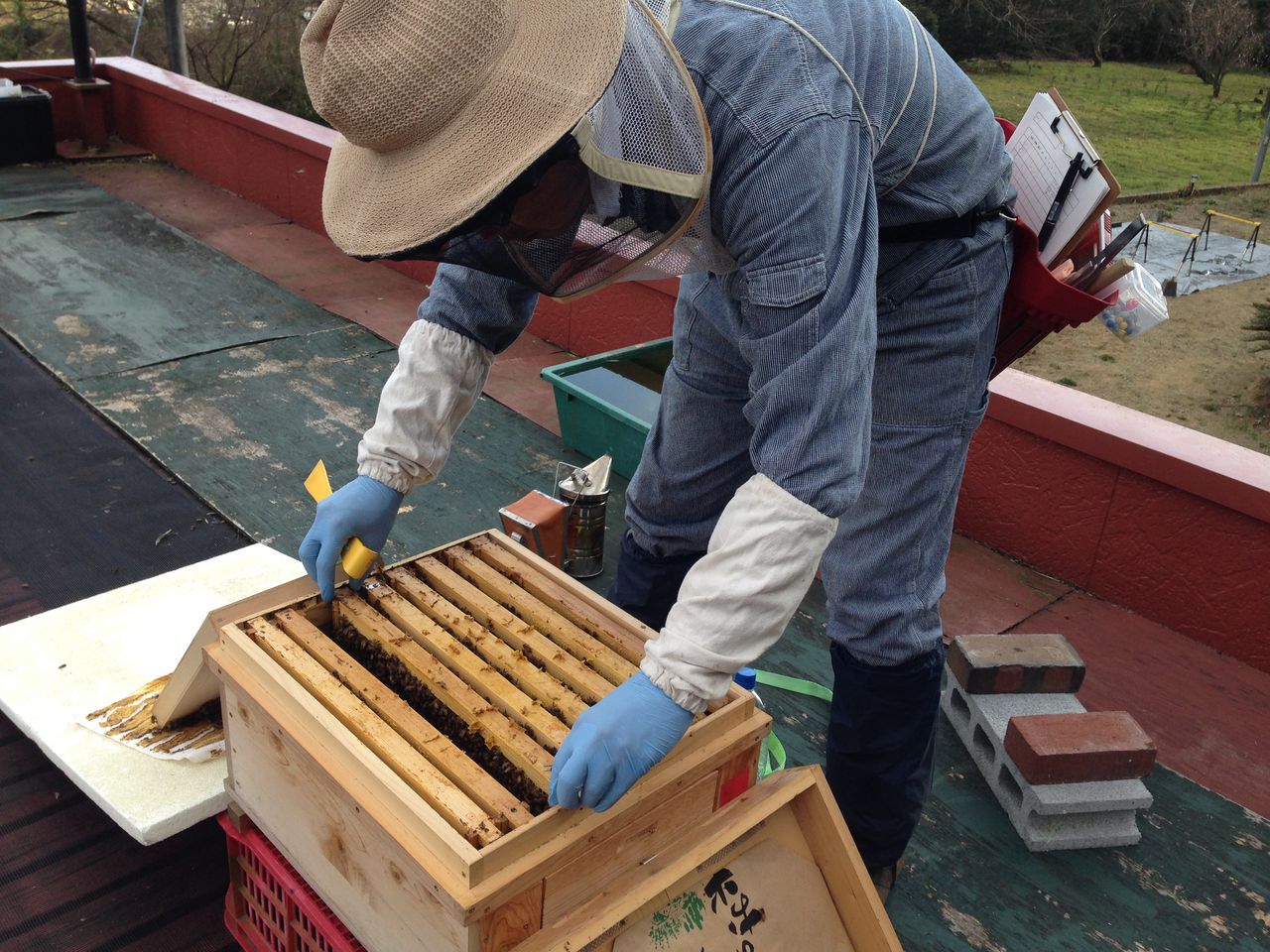 蜂の様子を観察し、巣箱の環境を整える。